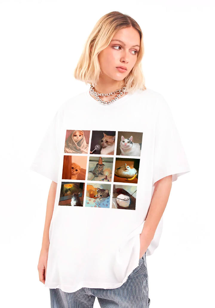 El outfit definitivo para amantes de los gatos y del internet. Esta polera presenta una cuadrícula de los memes felinos más virales y reconocibles de la cultura digital. Cada imagen es un homenaje al caos adorable de los michis que conquistaron la web. Ideal para quienes buscan ropa con personalidad, humor y mucha actitud gatuna.